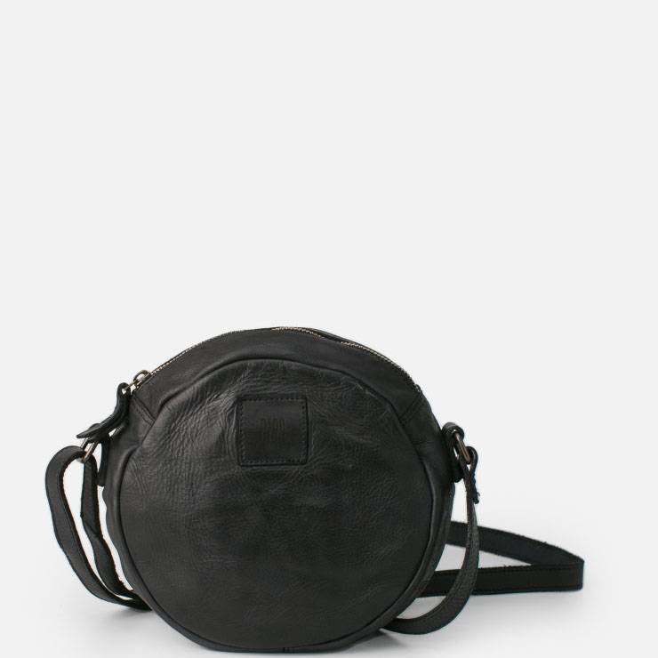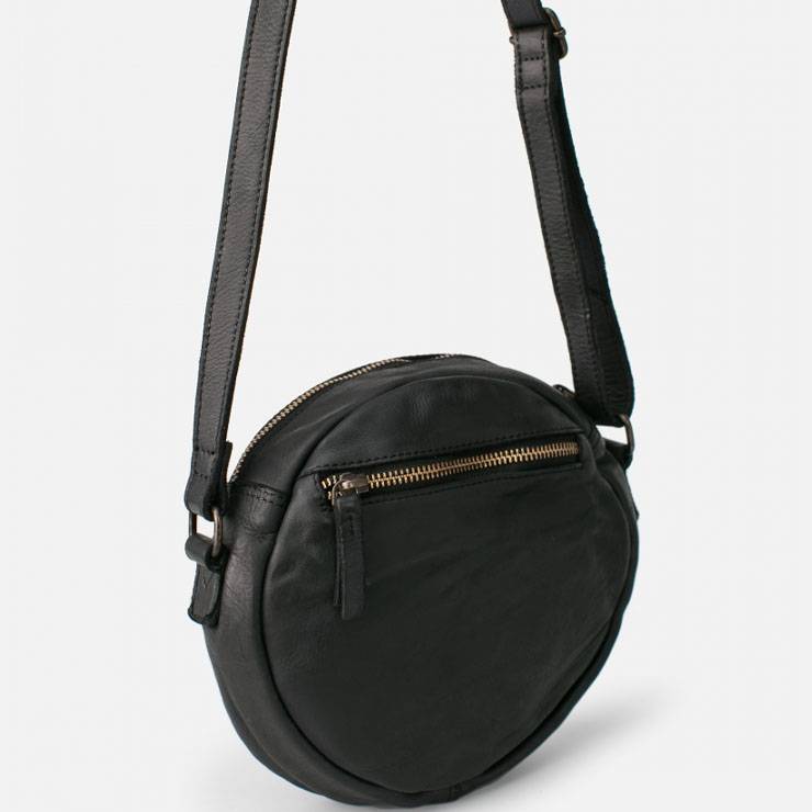 Bolso tipo bandolera redondo. Cierre con cremallera, bandolera regulable, bolsillos externos e internos, y forro de algodón. Medidas: 20 x 20 x 5 cm