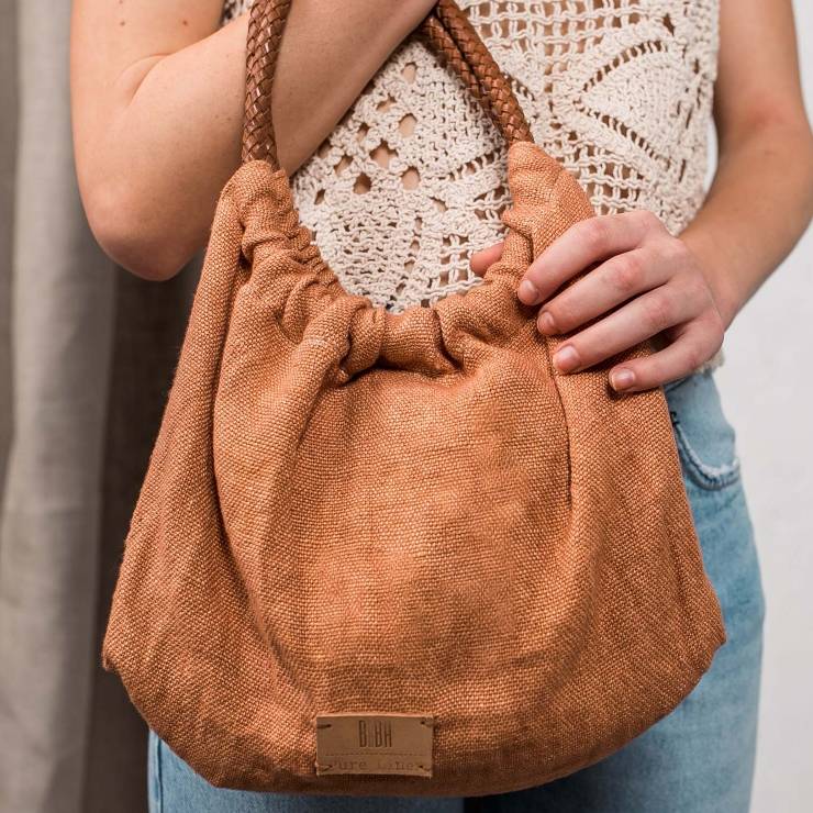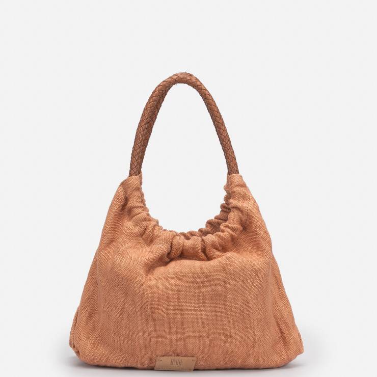 Bolso de la marca Biba, modelo Lily LIL2B en color arena. Bolso de mano de lino, asas de piel trenzadas a mano. Bolsillos externos e internos, cierre con botón y forro de algodón. Dimensiones: 30 x 25 x 8 cm.