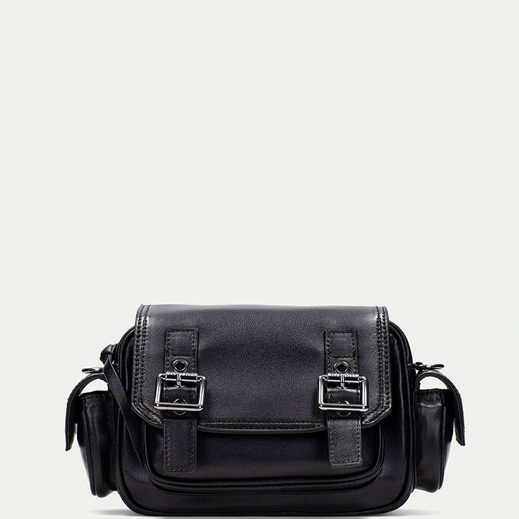 Bolso de hombro en PU. Cierre con cremallera y solapa. Bolsillos exteriores. Hebillas decorativas en la solapa. Correa extensible. Medidas: 26x17x10 cm.