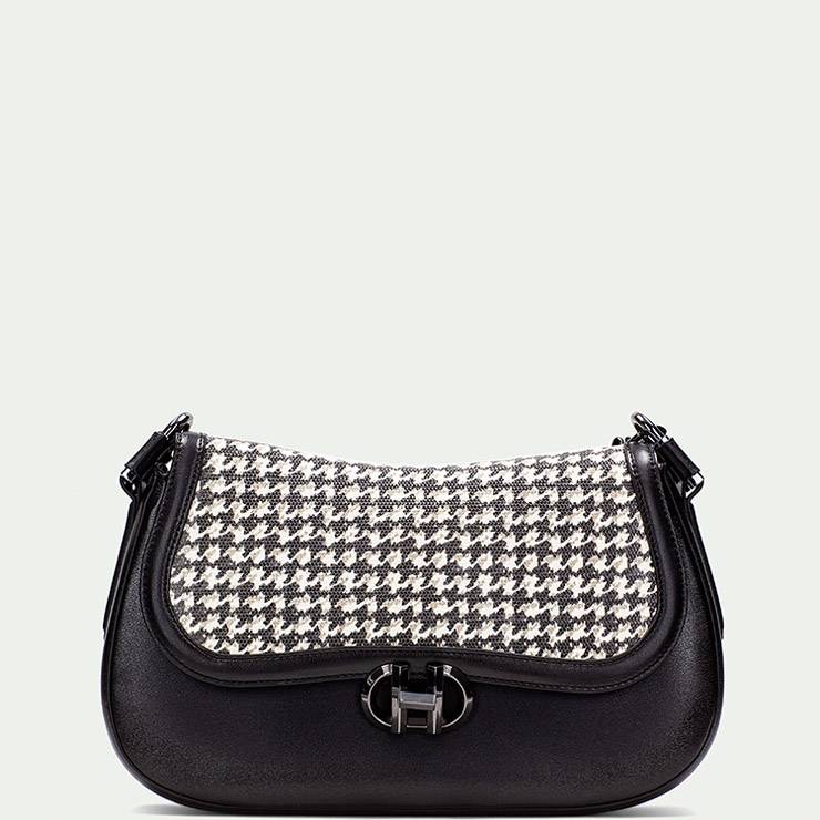 Bolso media luna elaborado en PU. Cierre de solapa con estampado tweed. Correa extensible. Forro interno. Medidas: 30x18x9 cm.