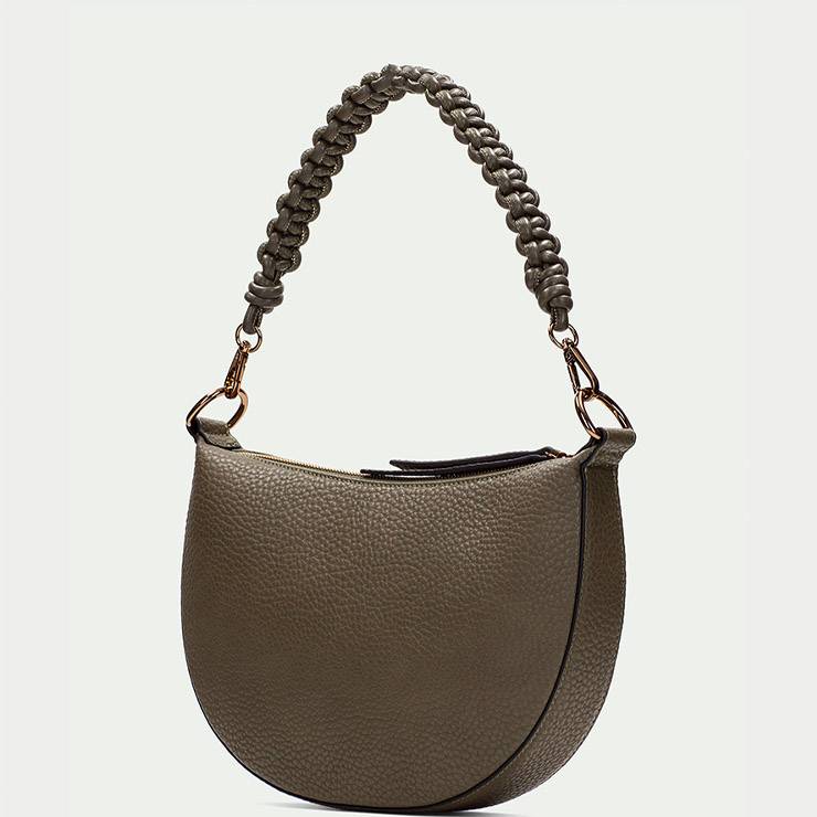 Bolso hobo media luna elaborado en PU. Cierre de cremallera. Correa de macramé. Bolsillo interno con cierre de cremallera. Medidas: 28x18x5 cm.