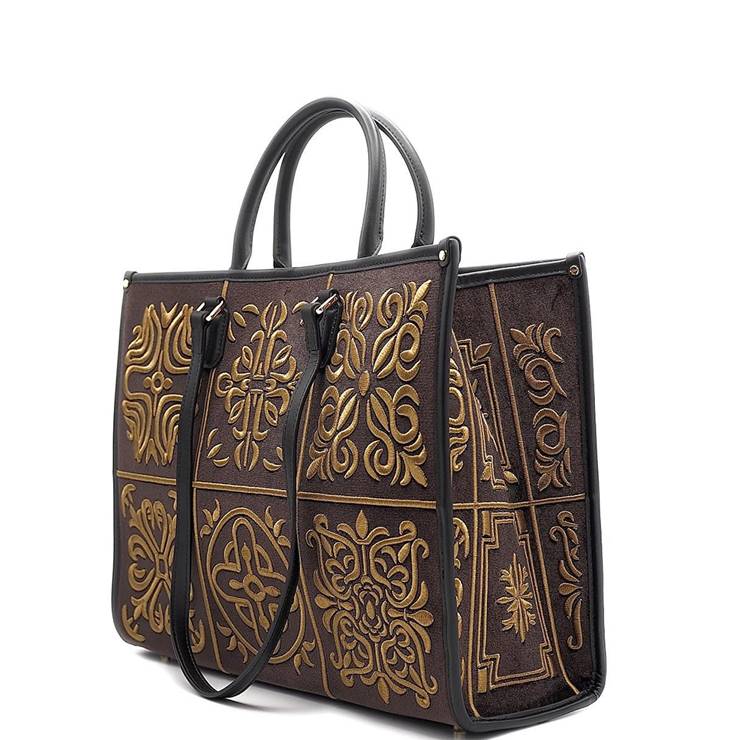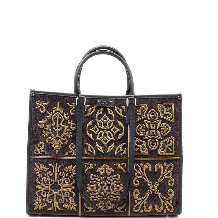 Bolso tipo mini shopper de terciopelo y piel con bordados. Doble asa y tira larga para llevar en bandolera. Cierre con mosquetón. Incluye una bolsita interior extraíble con cremallera. Medidas: 28,5 x 20 x 11 cm.