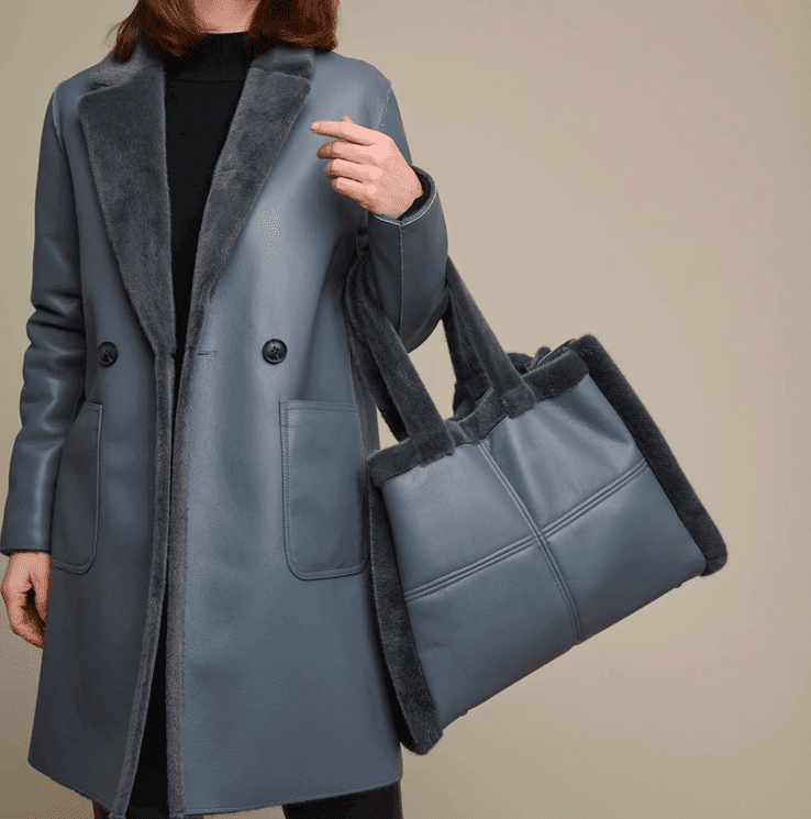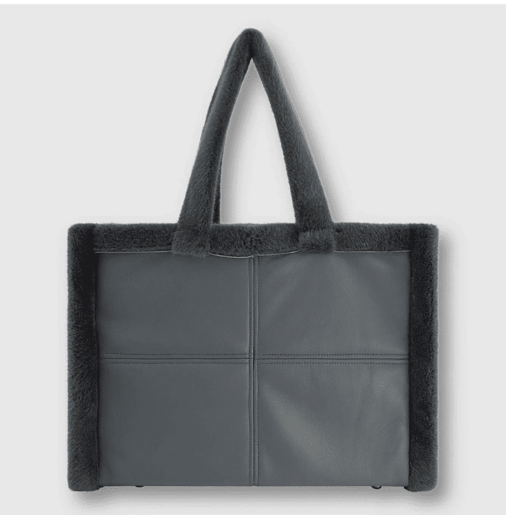 Bolso tipo shopper de piel vegana con detalles de pelo sintético. Dos asas cortas superiores de pelo sintético, detalles cosidos, cierre de botón a presión en la parte superior abierta y un bolsillo interno con cierre de cremallera.