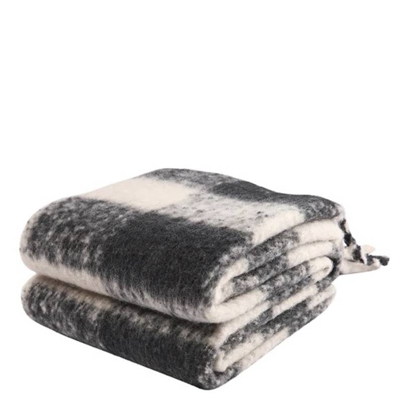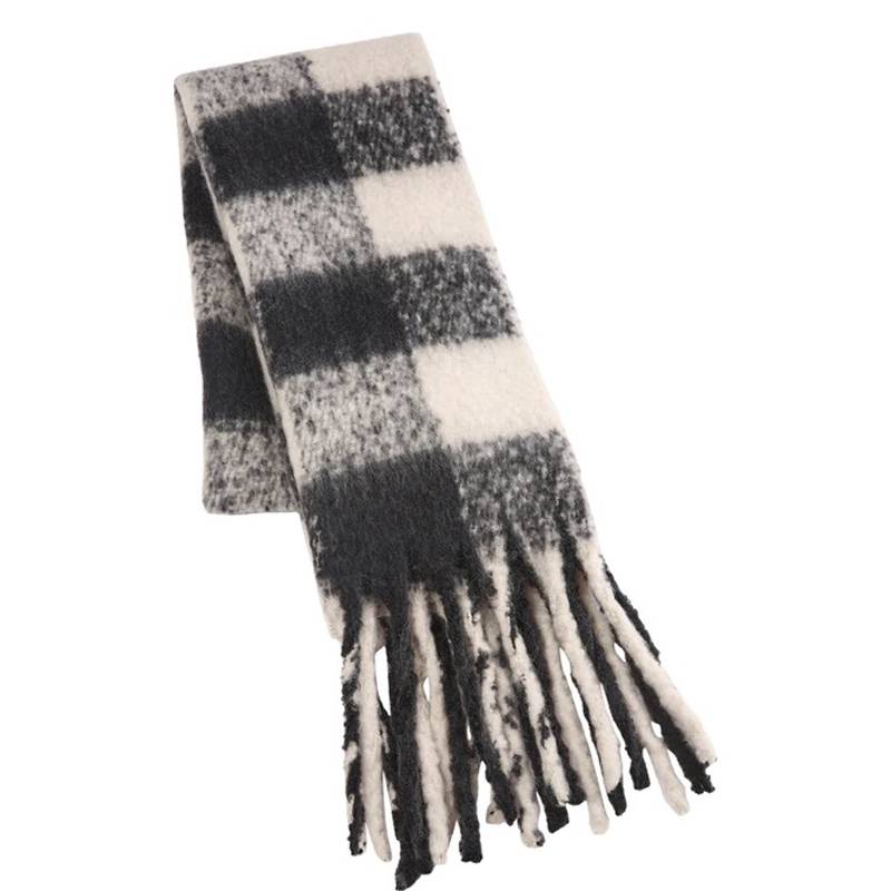 Bufanda maxi con estampado de cuadros en blanco y negro. Detalle de acabado con flecos.