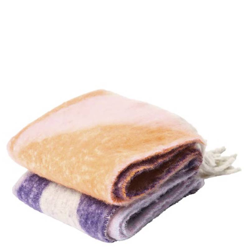 Bufanda maxi con estampado de rayas en tonos naranja y rosa. Detalle de acabado con maxi flecos.