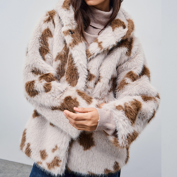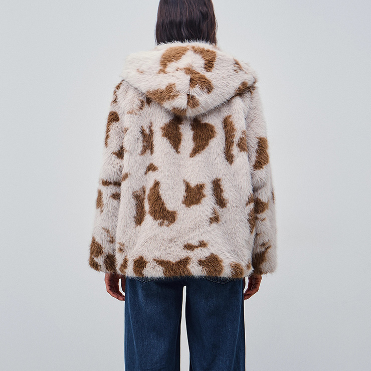 Abrigo corto elaborado en pelo sintético con estampado de vaca. Detalle de capucha. Cierre con botones. Diseño recto. Suave al tacto.