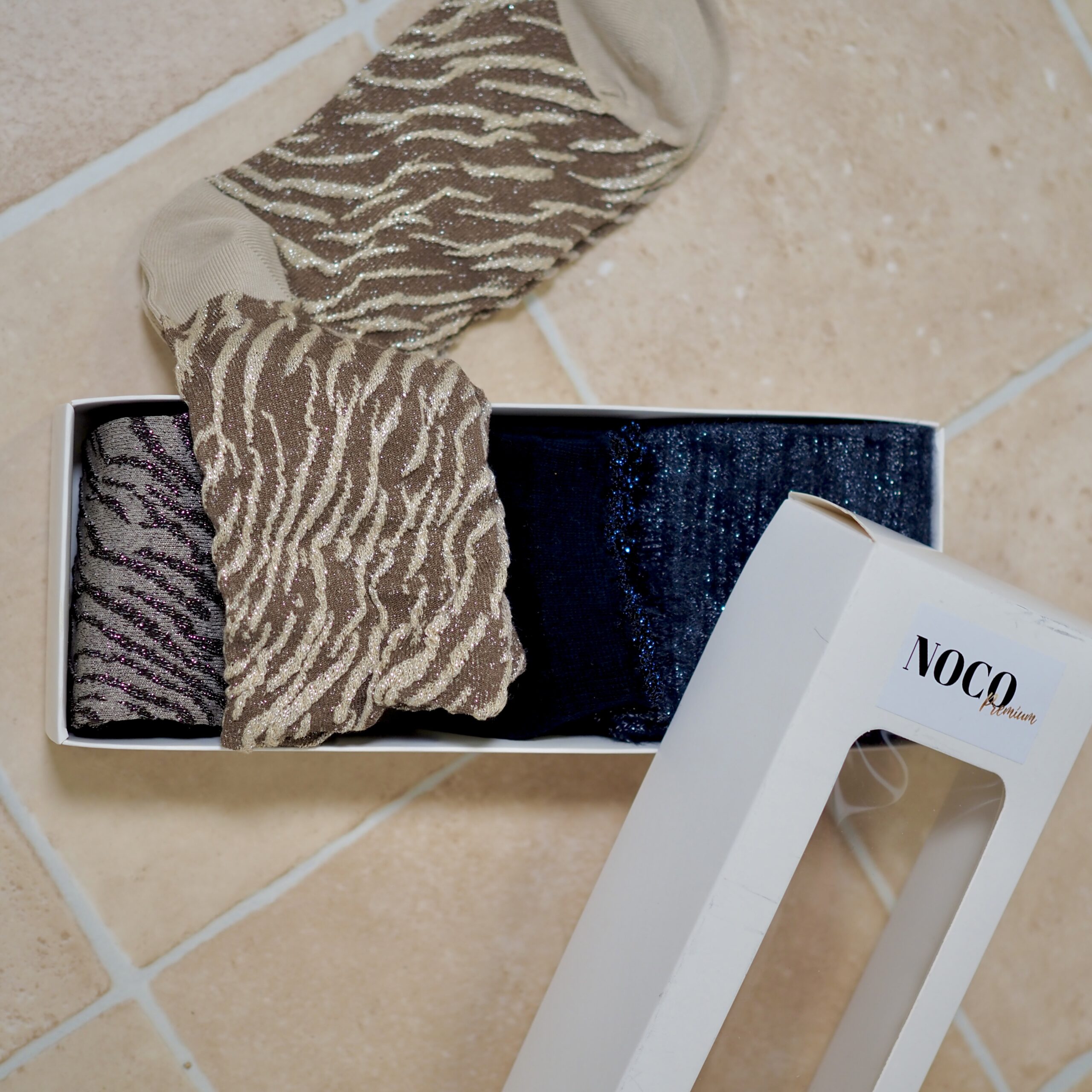 Caja de 4 calcetines de lúrex con estampado de cebra y brillo en tonos marrón.