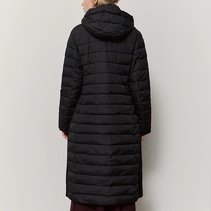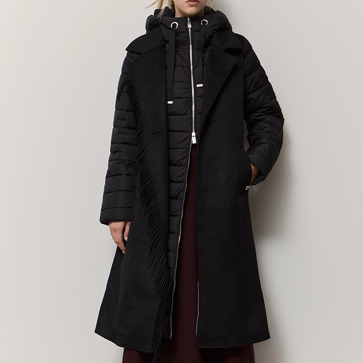 Chaqueta tipo anorak en combinación de tejidos. Acolchada larga, mangas largas, capucha, cierre con cremallera, tejido en contraste, detalles con flecos, bolsillos, diseño recto.