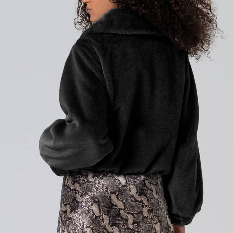Chaqueta tipo bomber confeccionada en tejido peluche extra suave. Diseño sin forro. Cuello amplio y mangas abullonadas. Bajo elástico. Cierre con cremallera.