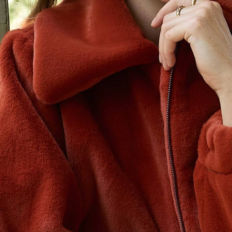 Chaqueta tipo bomber confeccionada en tejido peluche extra suave. Diseño sin forro. Cuello amplio y mangas abullonadas. Bajo elástico. Cierre con cremallera.