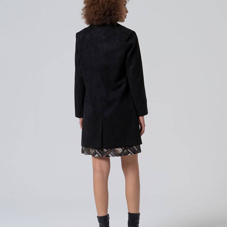Chaqueta tipo levita confeccionada en un tejido técnico de poliéster con acabado aterciopelado y elástico. Corte oversize sin forro y cierre con un botón.