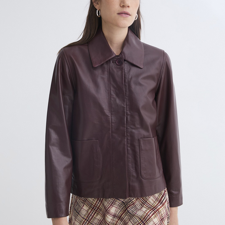 Chaqueta corta 100% piel de napa. Regular fit. Forro interior. Cuello camisero. Manga larga. Cierre con botones a presión bajo solapa. Un botón visible en cuello. Dos bolsillos de plastrón delante.