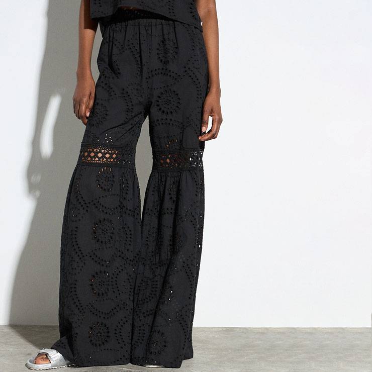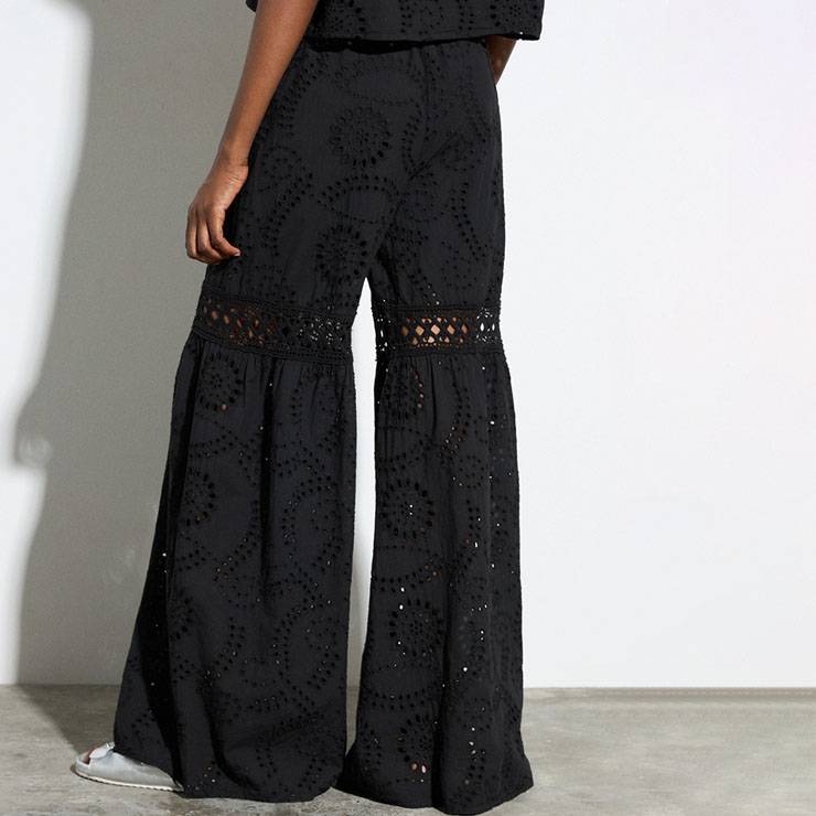 Pantalón largo en algodón 100%. Detalle de bordados y calados. Cintura elástica. Corte acampanado.