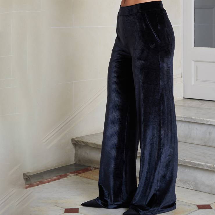 Pantalón ancho elaborado en poliamida y elastano. Corte fluido. Terciopelo brillante. Bordado de espiga en los bolsillos.