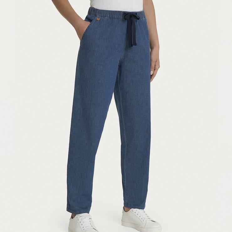 Pantalón largo elaborado en Super Light Denim, un denim elástico muy ligero. Corte deportivo y recto. Cintura elástica con cordón de ajuste en negro. Bolsillos franceses laterales. Detalle de vueltas ajustables en el bajo.