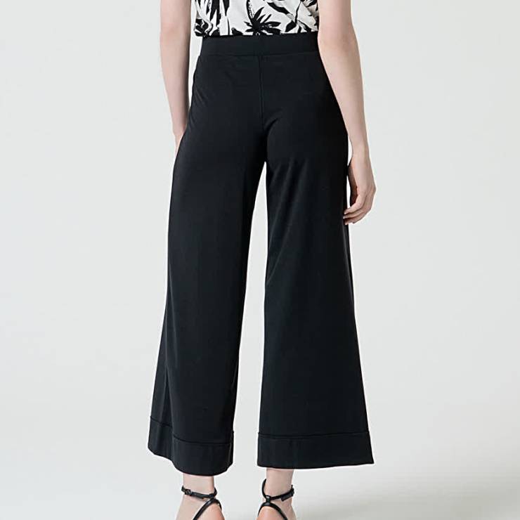 Pantalón en mezcla de rayón ligeramente satinado y elástico. Estilo flare tobillero sin bolsillos y sin cierre. Detalle de vuelta en el bajo.