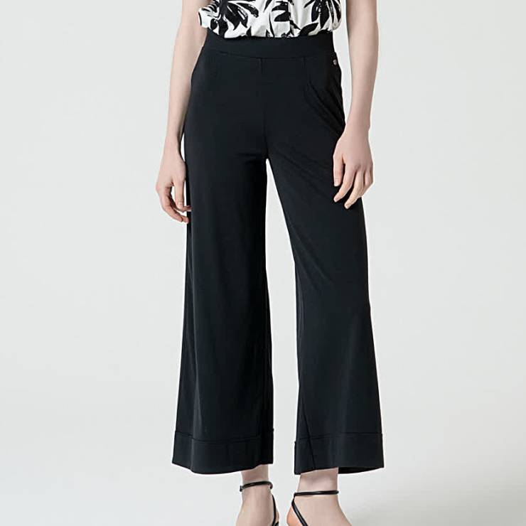 Pantalón en mezcla de rayón ligeramente satinado y elástico. Estilo flare tobillero sin bolsillos y sin cierre. Detalle de vuelta en el bajo.