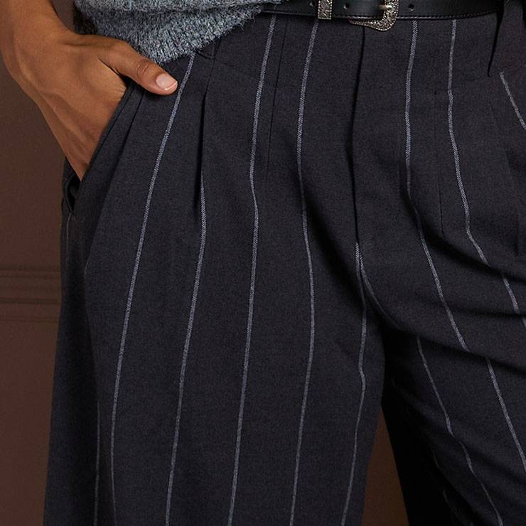 Pantalón wide leg fluido con pinzas frontales, confeccionado en tejido elástico con raya diplomática. Trabillas anchas, bolsillos laterales y cierre frontal con botón invisible.