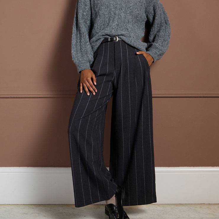 Pantalón wide leg fluido con pinzas frontales, confeccionado en tejido elástico con raya diplomática. Trabillas anchas, bolsillos laterales y cierre frontal con botón invisible.