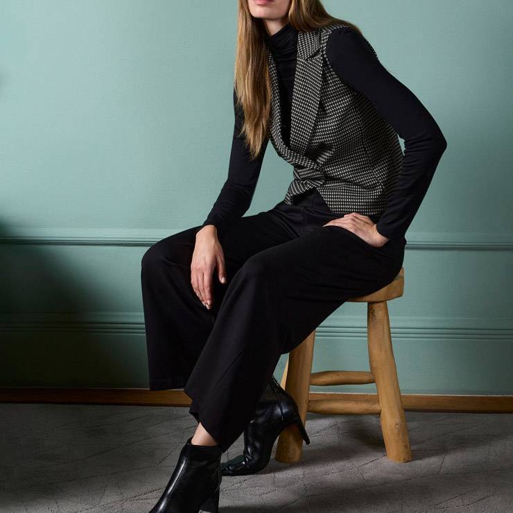 Pantalón flare ligeramente acampanado en tejido elástico. Sin cierres. Botones decorativos en la cintura.