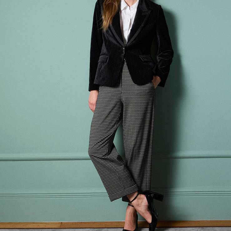 Pantalón en tejido elástico de corte recto con estampado pata de gallo. Cierre frontal invisible con botón y cremallera. Bolsillos laterales.