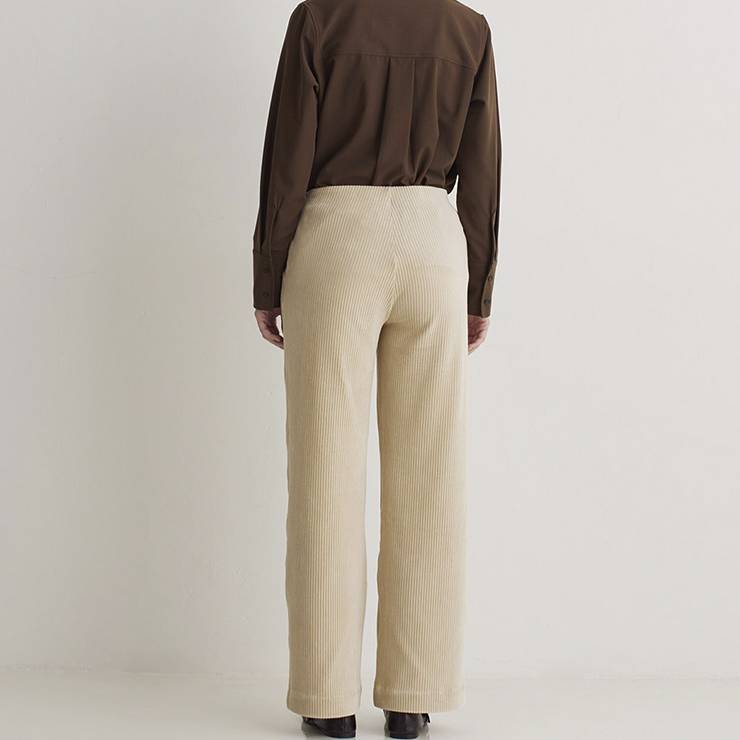 Pantalón de pana de punto. Tejido mezcla de algodón. Corte ancho. Sin cierre. Goma en la cintura. Dos bolsillos laterales.