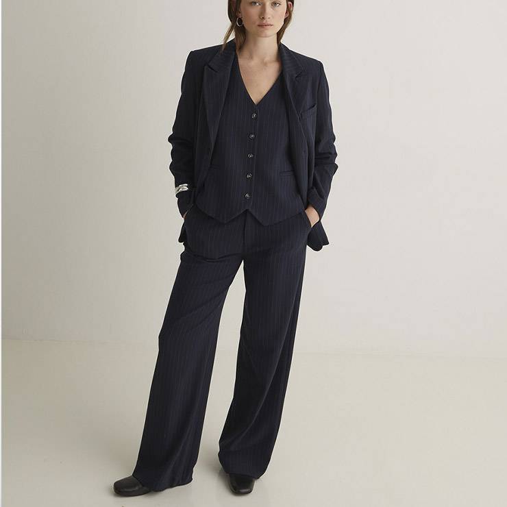Pantalón wide leg en tejido Jacquard mezcla de fibras recicladas y viscosa. Estampado raya diplomática. Cierre con cremallera y gancho metálico. Con trabillas en cintura. Cintura con goma elástica detrás. Dos bolsillos laterales y 2 de vivo detrás.