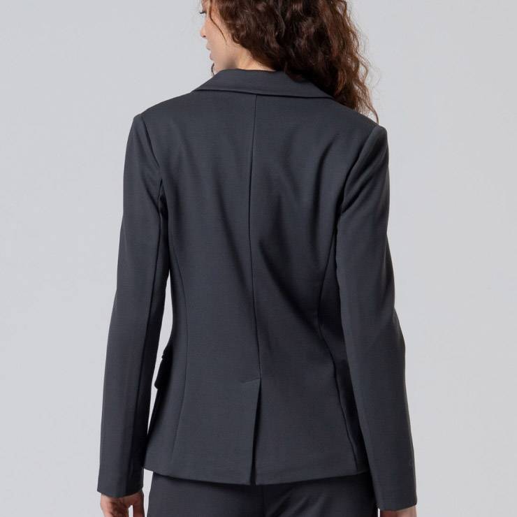 Americana de corte clásico en tejido elástico. Cuello con solapa. Suave al tacto. Bolsillos delanteros y cierre con dos botones.