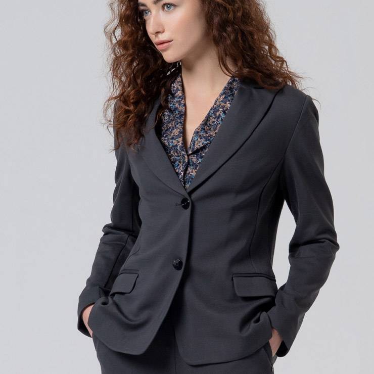 Americana de corte clásico en tejido elástico. Cuello con solapa. Suave al tacto. Bolsillos delanteros y cierre con dos botones.