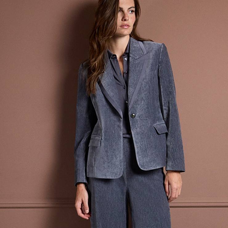 Americana tipo blazer de corte clásico en tejido elástico efecto terciopelo. Cuello con solapa y detalle de ribete. Suave al tacto. Cierre con botón.