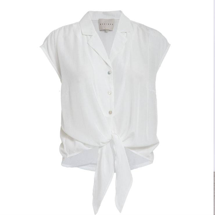 Camisa sin mangas elaborada en viscosa y poliéster. Cuello camisa. Botones nacarados en la parte frontal. Detalle de nudo en el bajo.