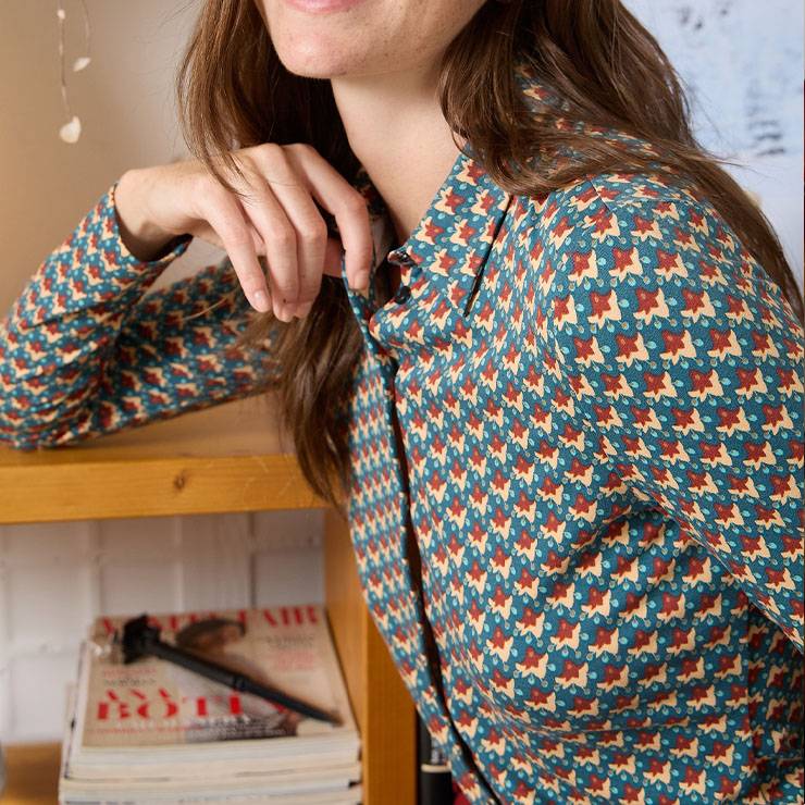 Camisa de manga larga confeccionada en viscosa suave y elástica. Micro estampado de aire retro. Corte clásico con cuello camisero. Cierre con botones.