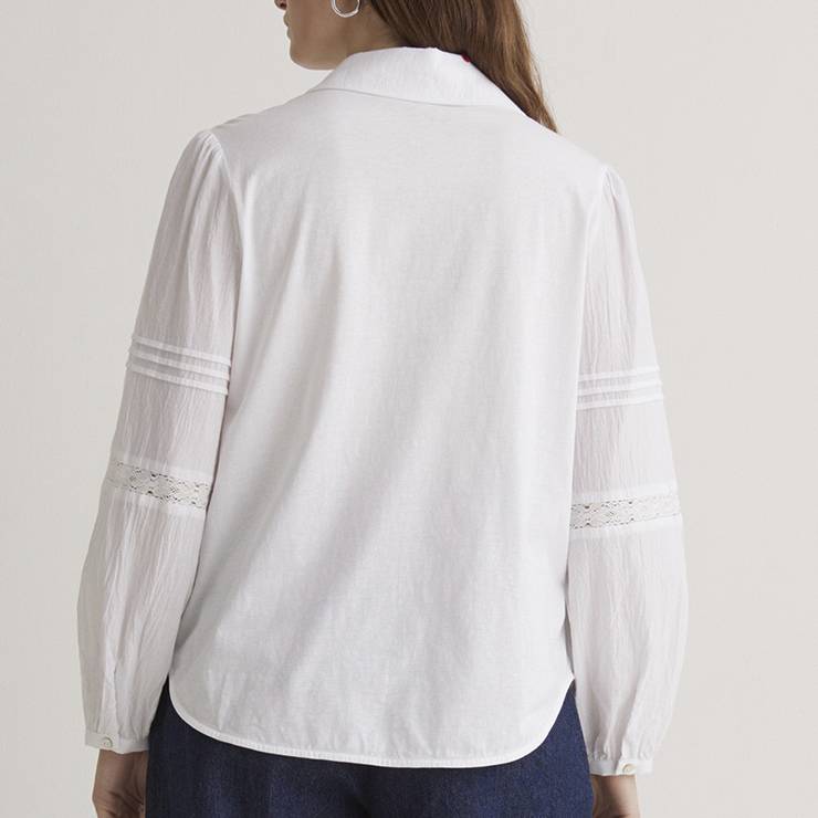 Camisa tipo blusa elaborada en algodón. Cuello camisero. Manga larga. Puños con botón. Cierre con botones nacarados. Detalle de puntillas y pliegues.