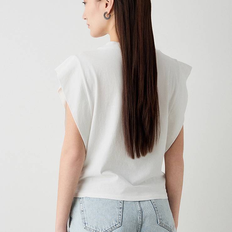 Camiseta tipo blusa elaborada en algodón 100%. Manga corta tipo hombrera y escote redondo. Diseño de corte recto.