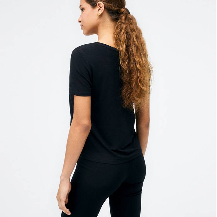Camiseta de talle ancho y manga corta elaborada en viscosa elástica. Cuello escotado redondo. Tejido muy cómodo.