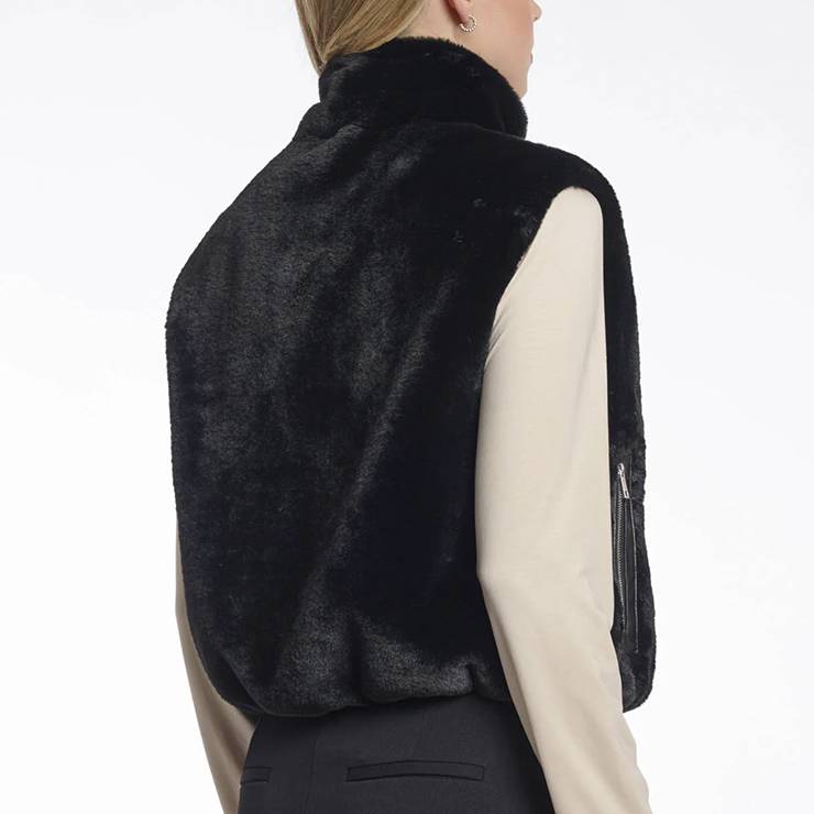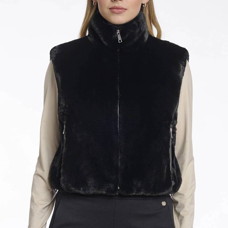 Chaleco corto elaborado en suave pelo sintético. Cierre de cremallera. Aberturas laterales. Bolsillos con cremallera.