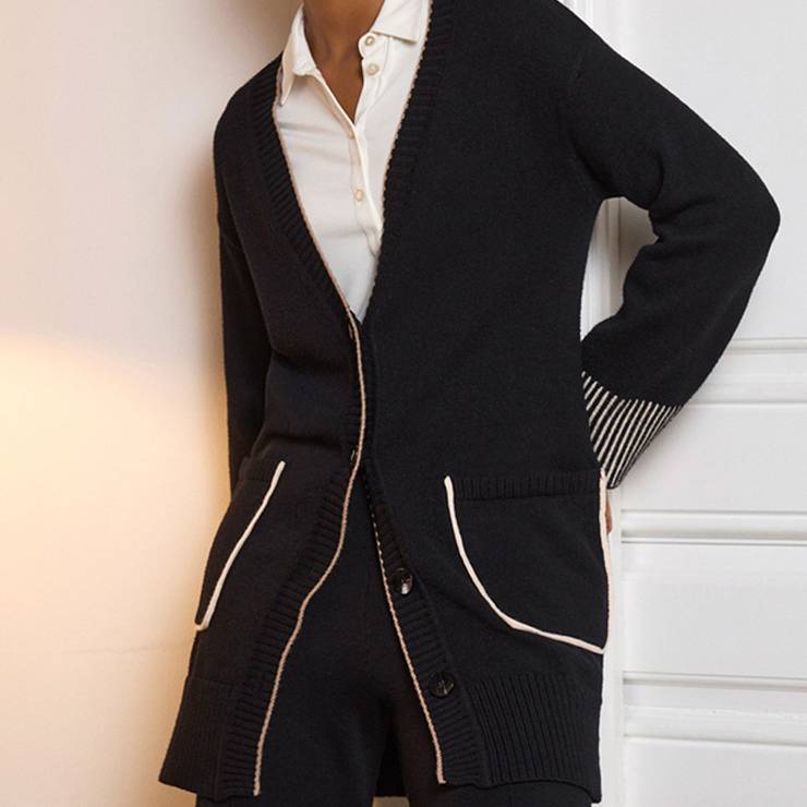 Chaqueta tipo cárdigan largo de tricot. Cierre de botones. Bolsillos de parche y vivos a contraste.