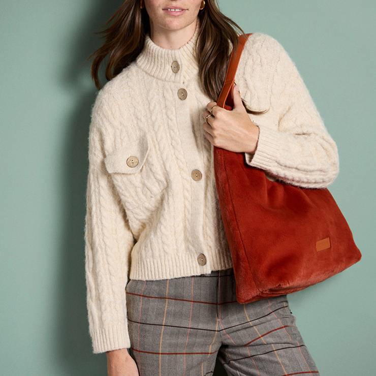 Chaqueta tipo cárdigan de punto tricot aranés. Botones grandes y bolsillos de solapa. Corte recto. Punto grueso reciclado.