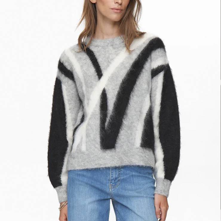 Jersey elaborada en mezcla de suaves tejidos. Estampado abstracto en blanco y negro. Corte holgado. Ribetes en canalé. Pequeñas aberturas laterales.
