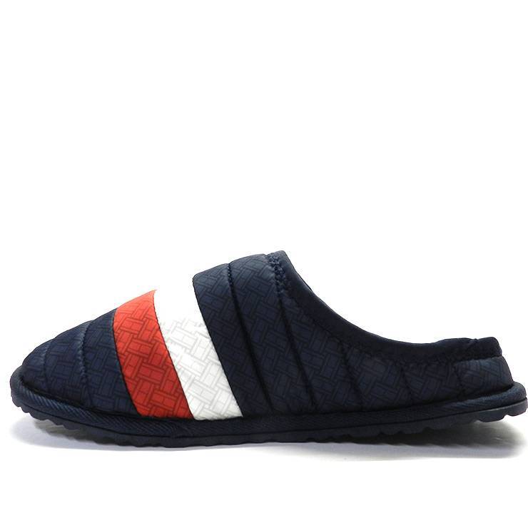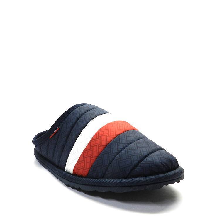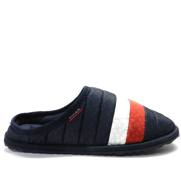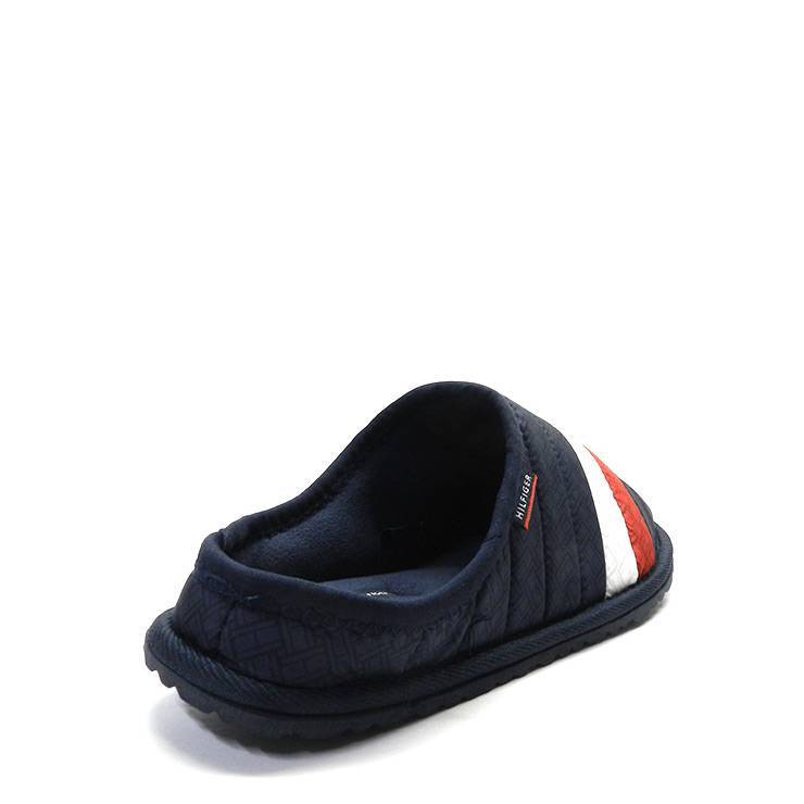 Zapatillas de casa de hombre de la marca Tommy Hilfiger, modelo Corporate Padded en color azul. Zapatillas destalonadas en tejido acolchado. Franja tricolor en azul, blanco y rojo característica de la marca. Interior de felpa. Suela de goma.