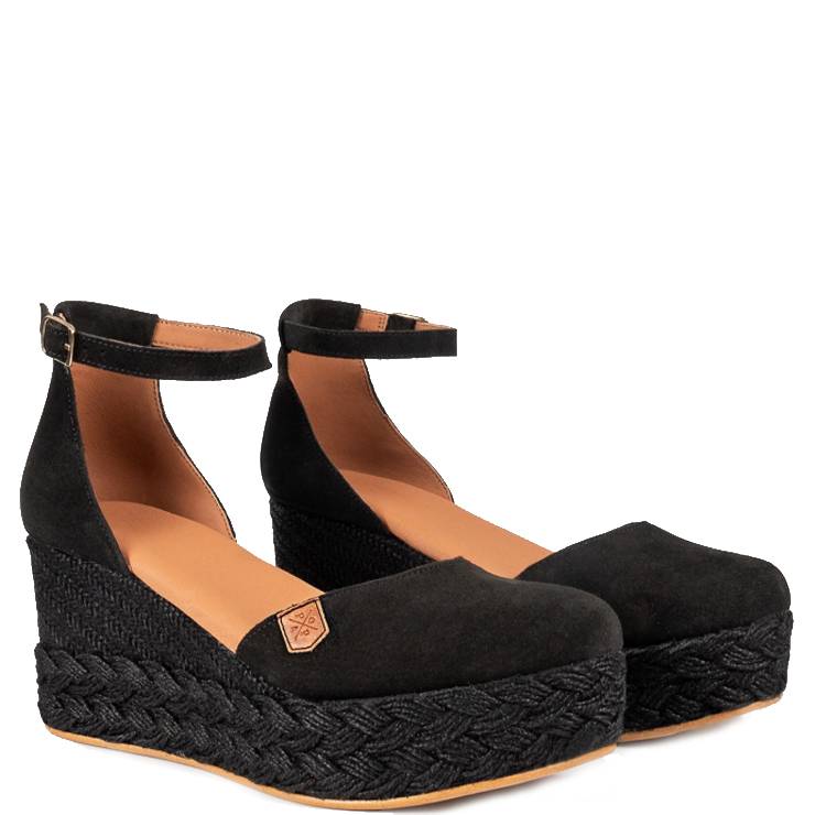 Alpargata con cuña elaborada en serraje. Cuña de 7 cm y plataforma de 3 cm de yute trenzado al tono. Puntera cerrada y suave al tacto. Plantilla acolchada. Cierre con hebilla ajustable al tobillo.