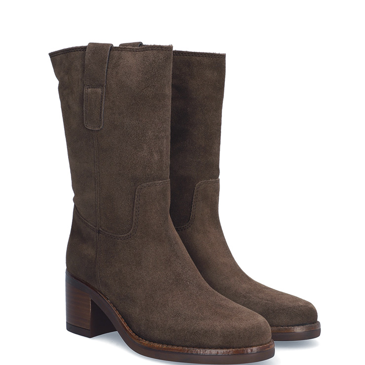 Bota tipo campera elaborada en piel de serraje. Tacón bloque de 6 cm de altura. Sin cierre. Tiradores laterales para facilitar el calce. Suela de goma antideslizante.