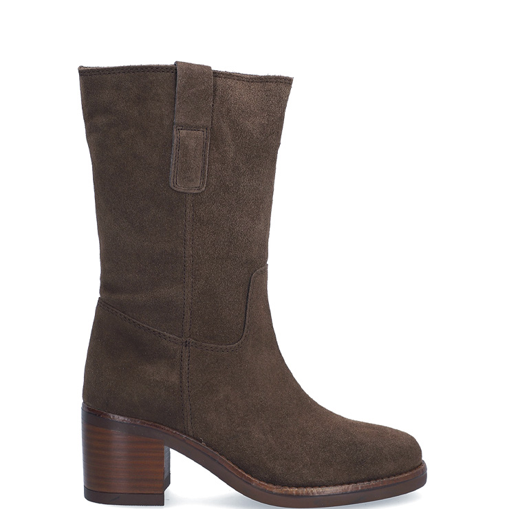 Bota tipo campera elaborada en piel de serraje. Tacón bloque de 6 cm de altura. Sin cierre. Tiradores laterales para facilitar el calce. Suela de goma antideslizante.
