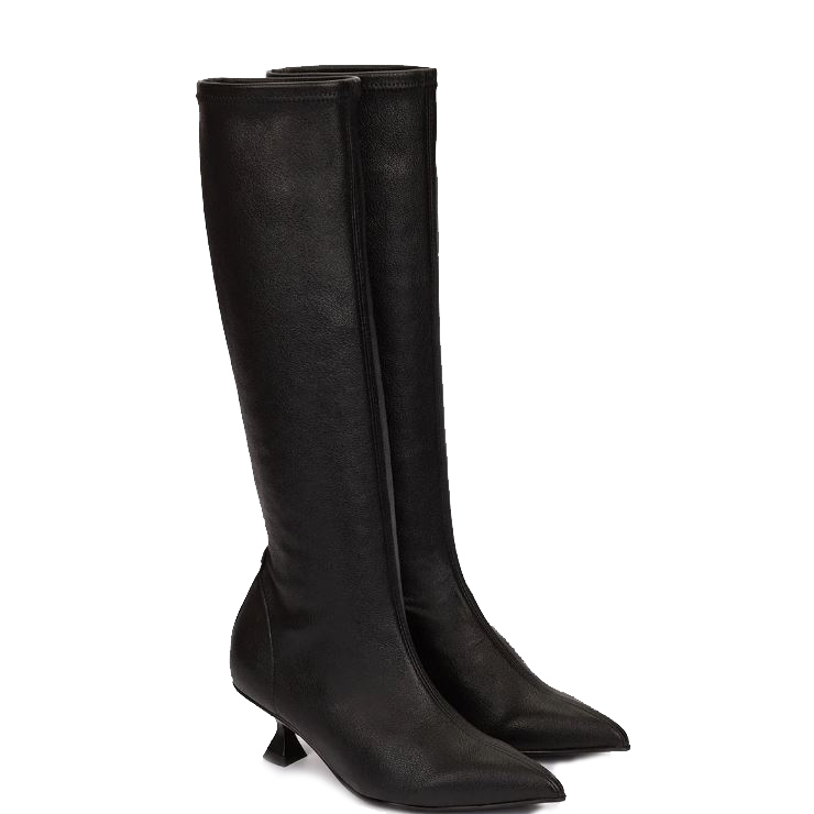 Bota elaborada en material sintético elástico tipo ante. Suela de goma. Tacón fino de 6 cm de altura. Puntera afilada.