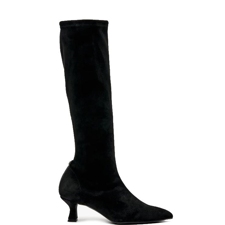 Bota elaborada en material sintético elástico tipo ante. Suela de goma. Tacón fino de 6 cm de altura. Puntera afilada.