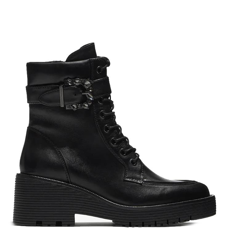 Bota tipo biker elaborada en piel. Forro interior de terciopelo. Suela de goma de 6 cm de altura. Cierre con cremallera lateral y cordonera central con cordones encerados. Detalle de hebilla con strass.