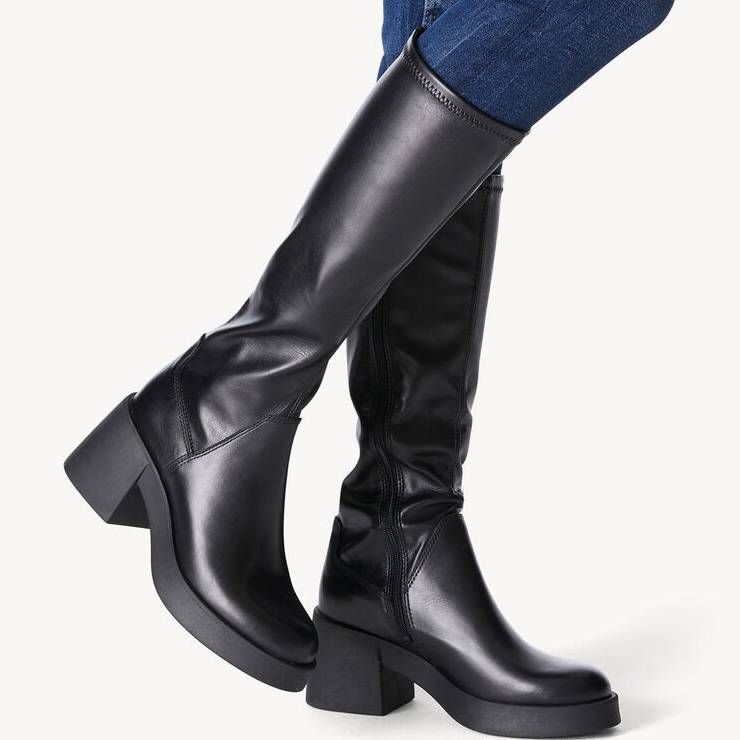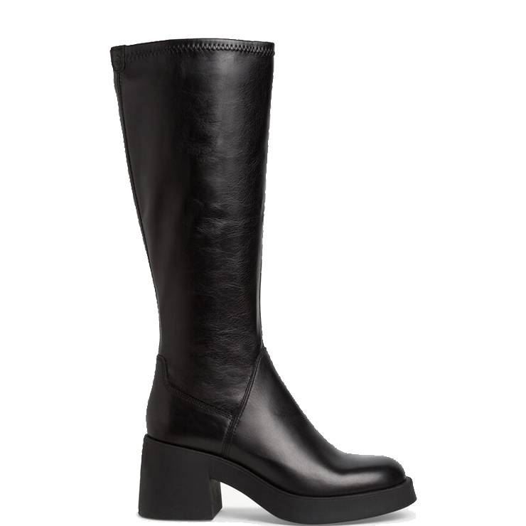 Bota elaborado en piel sintética elástica. Suela de goma con 1,5 cm y tacón banana de 8 cm de altura. Cierre con cremallera lateral interna.