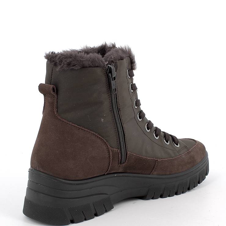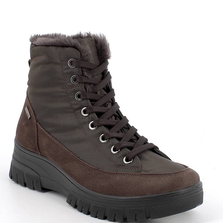 Botas de piel y poliéster. Interior forrado con pelo. Plantilla extraíble. Cierre con cordones y cremallera lateral. Horma ancha y membrana waterproof transpirable. Suela de goma de 4 cm de altura.