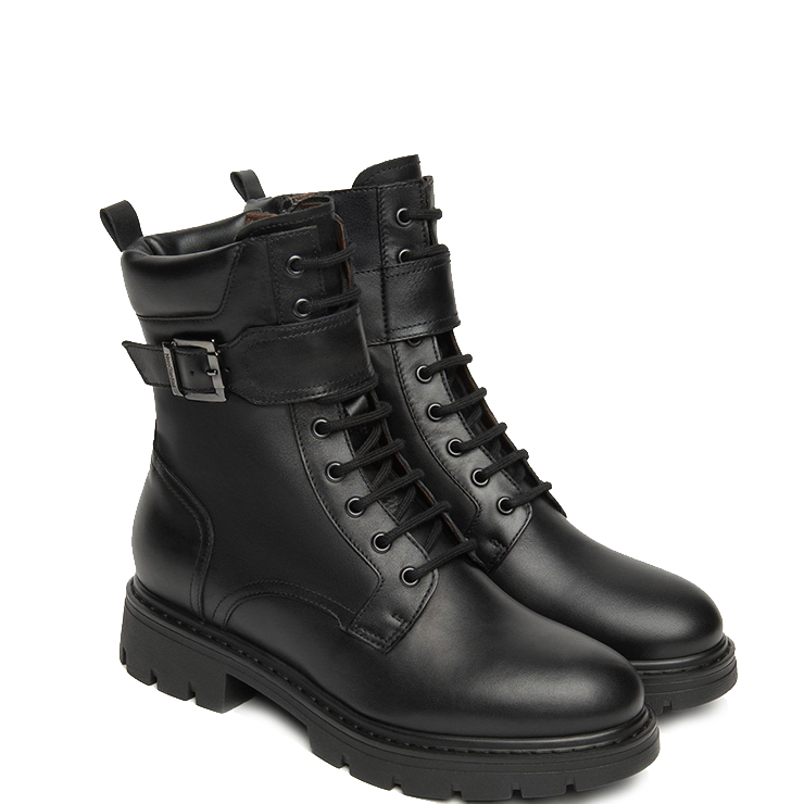 Botas estilo militar elaboradas en piel. Suela de goma con tacón de 3 cm. Cierre con cordones y cremallera lateral interna. Detalle de hebilla decorativa.