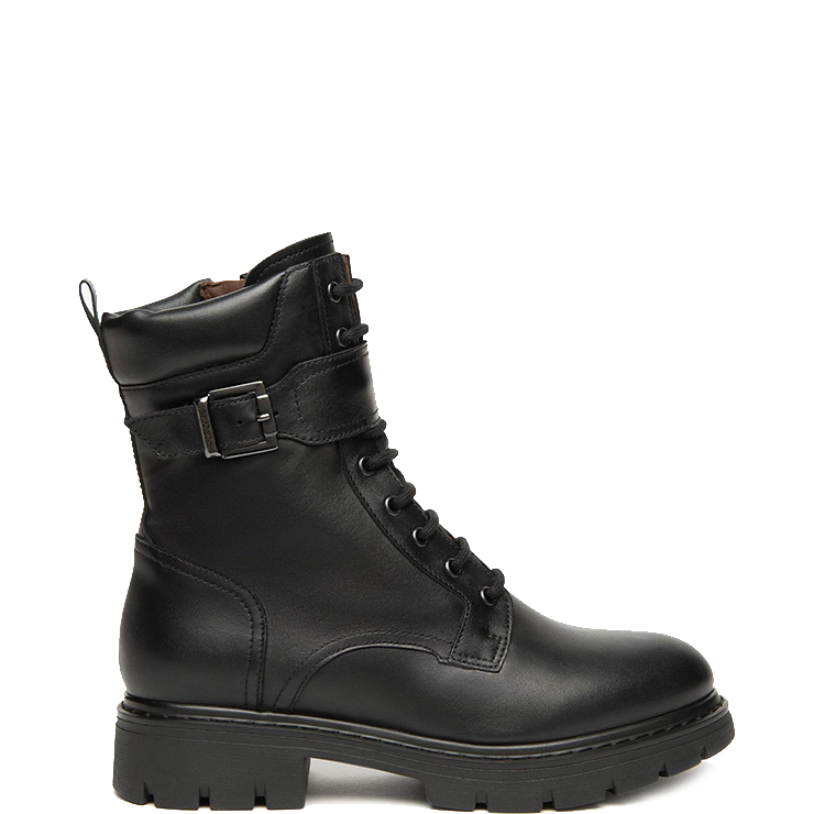 Botas estilo militar elaboradas en piel. Suela de goma con tacón de 3 cm. Cierre con cordones y cremallera lateral interna. Detalle de hebilla decorativa.